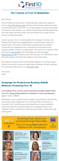 Featured: Campaign for Grade-Level Reading (CGLR) Webinars Featuring First 10 School-Community Partnerships | Swati Adarkar and Ralph Smith Visit to First 10 York, PA | Collectively Advancing Our First 10 Work