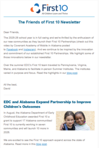 Featured: Letter announcing new First 10 communities and sharing news of presentations | Beyond Kindergarten: Transition, Continuity and Alignment | Webinar Presentation; First 10 Summer Institutes | A Partnership Focused on Family Engagement and Math
